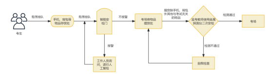 我考点将实行“智能安检门+人工安检”的双重安检机制。考生须在各考区指定的物品存放处提前存放手机等考试违禁物品以及与考试无关的包和物品,随后有序通过“智能安检门”,进入考试封闭管理区域。在正式进入考场前,还将接受人工安检,所有与考试无关的物品不得带入考场。